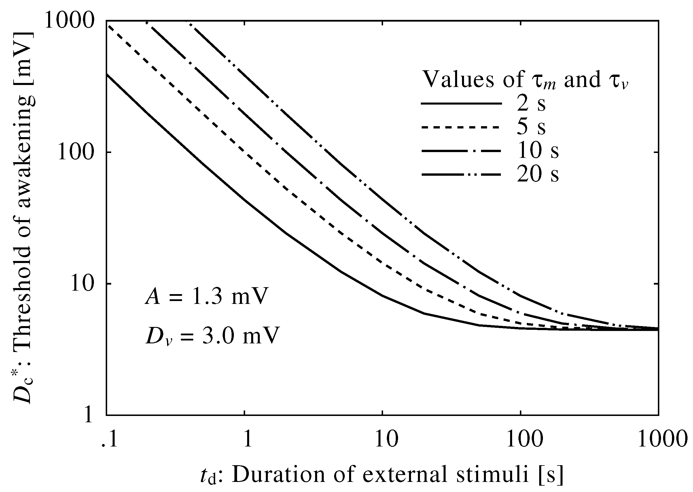 The relationship between the neuroelectrical thresholds of awakening and the duration of external stimuli allowed calculation of the system’s time constant. We set the time constant to 0.1, 1.0, 10, 30 and 100 s.
