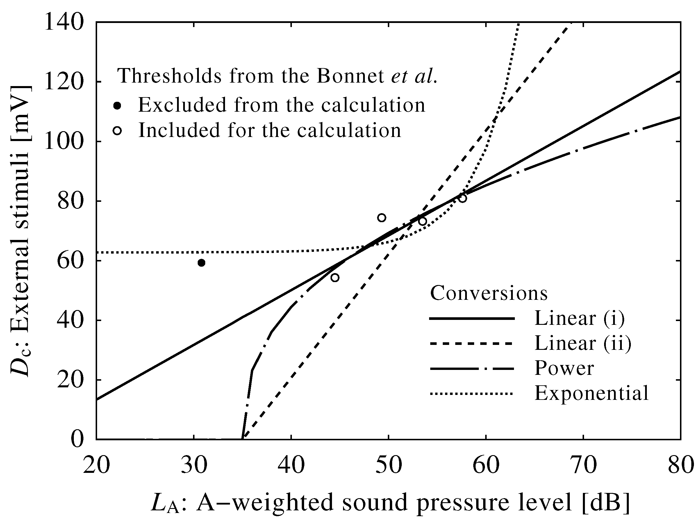 Experimental and mathematical results (see Table 1, white and black circles) and conversion curves of neuroelectrical stimuli to sound pressure levels. Note that the threshold falling after five minutes (black circle) was excluded from the calculation for obtaining conversions.