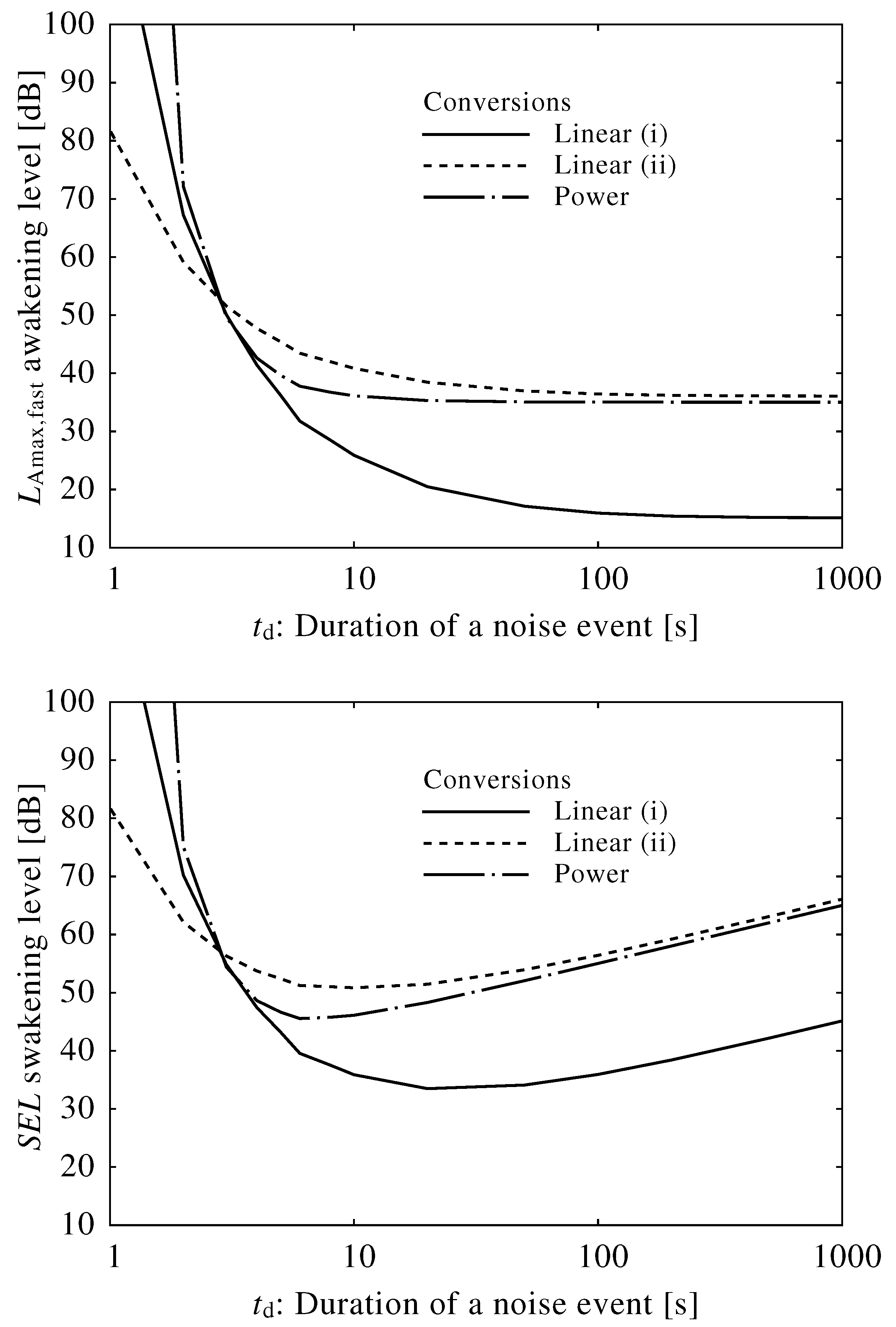 We tried to convert the neuroelectrical thresholds of awakening into average awakening levels in and SEL based on existing experimental results [38]. Although very limited data were available, we assumed three conversion equations. Each average awakening level changes substantially with fluctuations in the duration of the external stimulus, which suggests that both the and SEL overestimate the risk of awakening due to a short noise and that the SEL overestimates the risk due to a long noise.