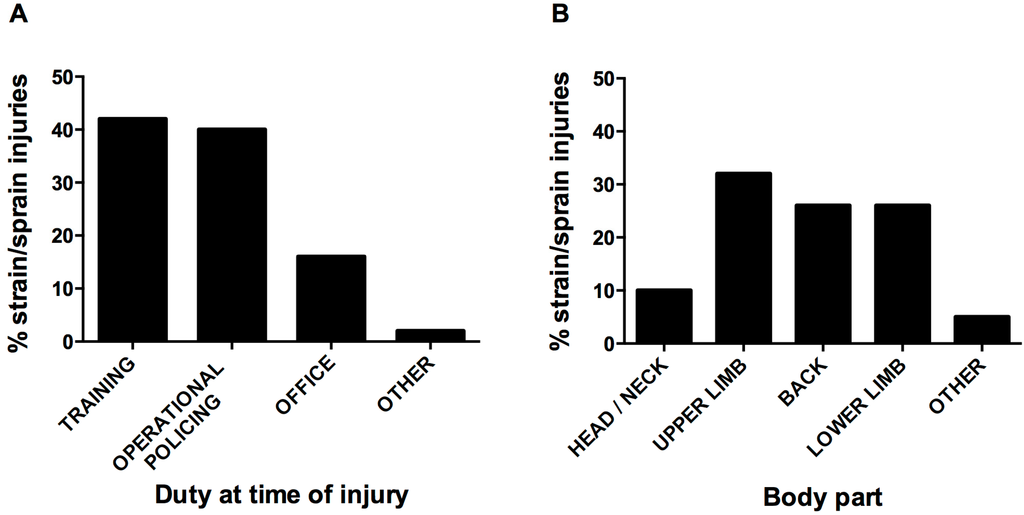 Due to the observed dominance of the strain/sprain injury type, a dedicated analysis was conducted. Figure 1 provides a breakdown of strain/sprain injuries by duty type (A) and body part (B). For the purpose of the figure, training (operational) and training (fitness) have been combined into a single “training” category. “Operational policing” has been used to describe any duties outside the office, whereas “office” reflects typical office duties (i.e., administration tasks). For brevity, the body part injured categories have also been condensed (from the categories provided in Table 2).