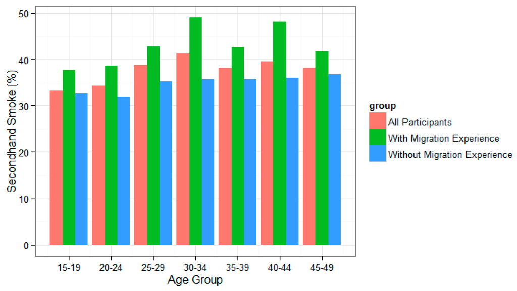 Figure 1 demonstrates the SHS exposure rates of different age groups (“15–19”, “20–24”, “25–29”, “30–34”, “35–39”, “40–44”, “45–49”) for all participants, participants with and participants without migration experience. It shows that SHS exposure rates among women with migration experience were higher than among those without migration experience.