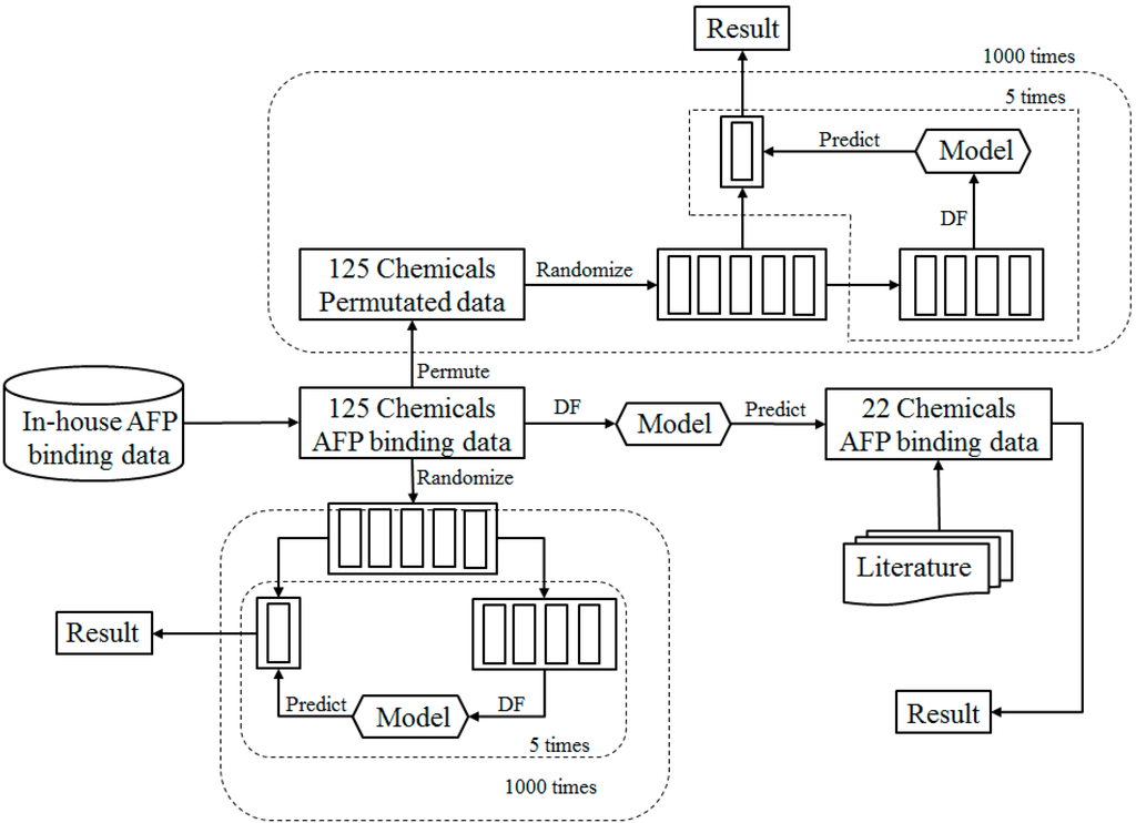 The study design is depicted in Figure 1 and the detail explanation for each step is described in the following sections. Briefly, the 125 chemicals and their rat AFP finding activity (53 binders and 72 non-binders) from our previous study [] were used as the training data set. First, 5-fold cross validations were conducted to evaluate the performance of Decision Forest (DF) model as illustrated in the bottom left part of Figure 1. More specifically, the training data set were randomly divided into five equal portions of chemicals. Four portions were used for training the DF model and the remaining portion was used for testing the DF model. The process was repeated five times so that each of the five portions was used as test data set to challenge the models that were constructed from the other four portions. The prediction results from the five DF models were averaged to estimate the models’ performance. To reach a statistically robust estimation of the DF models’ performance, the 5-fold cross validation process was iterated 1000 times. The resultant data from the 1000 iterations of 5-fold cross validation were used for prediction confidence analysis and identification of informative molecular descriptors that are important for AFP binding. Then, permutation tests were conducted to affirm that the prediction accuracy observed in the 5-fold cross validations was not achieved by chance, as illustrated in the top part of Figure 1. In brief, the binding activity data (binder or non-binder) of the 125 chemicals in the training data set were permutated first and a 5-fold cross validation was carried on the resultant permutated data set. The permutation test was repeated 1000 times to make sure that the permutation tests result is statistically robust. Finally, the whole training data set was used to train a DF model that was validated using an external data set. The external validation data set was curated from the literature [,,].