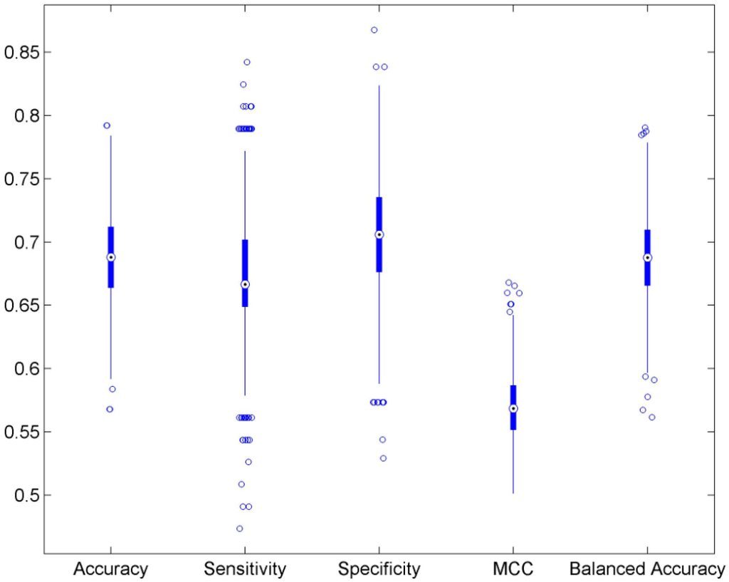 We conducted 1000 5-fold cross validation cycles using the training data set as shown in Figure 1. The prediction results from the DF models were compared with the actual AFP binding activity data to calculate the metrics for evaluation of the performance of the models. The 5-fold cross validation results were plotted in the boxplots of Figure 2 and are summarized in Table 1. The average values of accuracy, sensitivity, specificity, MCC and balance accuracy are 68.9%, 67.5%, 70.0%, 57.0% and 68.8% respectively. All performance metrics indicate a moderate prediction power of the DF models. The small standard deviation values obtained demonstrated that the DF models are statistically robust.