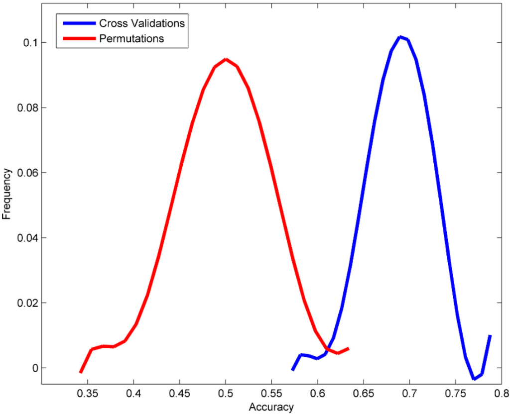 Distributions of the 1000 prediction accuracy values calculated from the DF models in permuation tests (red line) and yielded from the DF models in the cross validations (blue line).
