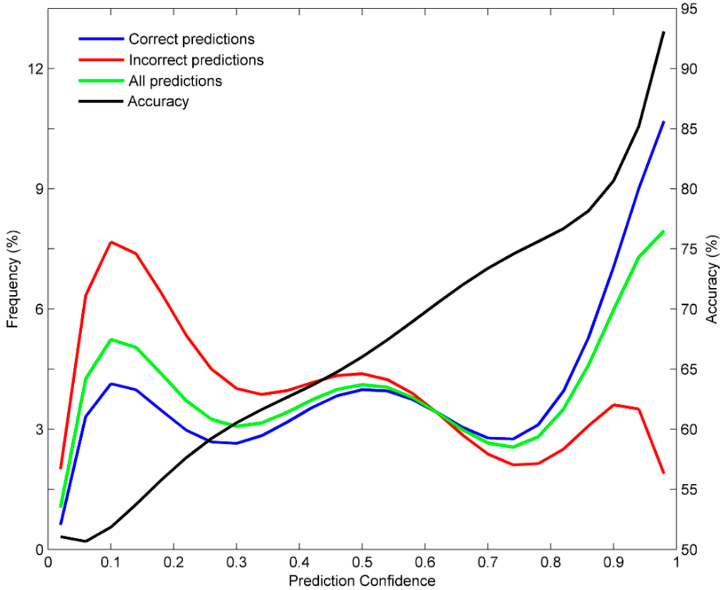 Predictions and accuracy at different confidence levels. The distributions of predictions were given by the left y-axis and the prediction accuracy is indicated by the right y-axis. Prediction confidence was given at the x-axis. Predictions are plotted in green line, correct predictions in blue line, incorrect predictions in red line, and prediction accuracy in black line.