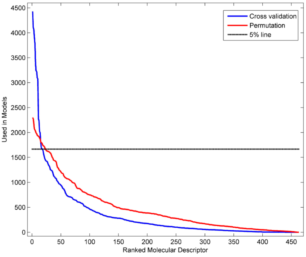 The more frequently a descriptor is used in QSAR models, the more informative it is to the QSAR models. The informative molecular descriptors are important for interpretation of QSAR models. To identify the informative descriptors to the DF models in the 5-fold cross validations, we first extracted the Mold2 descriptors that were actually used in the models. Then, the frequency of each of the 512 Mold2 descriptors used by the 5000 DF models was calculated. The results were plotted as the solid blue line in Figure 5. Similarly, the frequency of each Mold2 descriptor used in the 5000 DF models in the permutation tests was calculated. The results were displayed as the solid red line in Figure 5. The top 5% descriptors in the permutation tests were separated by the dotted black line at a frequency of 1680 models in Figure 5. Therefore, the Mold2 descriptors that were used in more than 1680 DF models in the 5-fold cross validations should be informative to the DF models at the 5% significance level in a statistical view. Using this cut-off, 16 Mold2 descriptors that were used by more than 1680 DF models were identified as the informative descriptors. Table 2 lists these 16 Mold2 descriptors, the numbers of DF models, and the descriptor definitions.