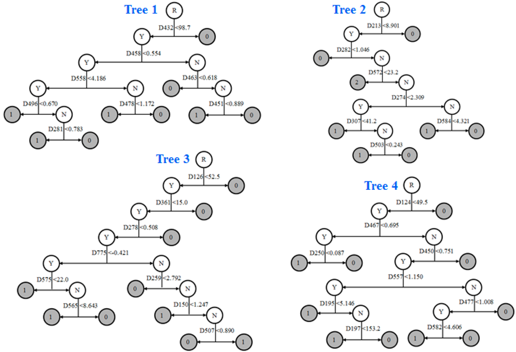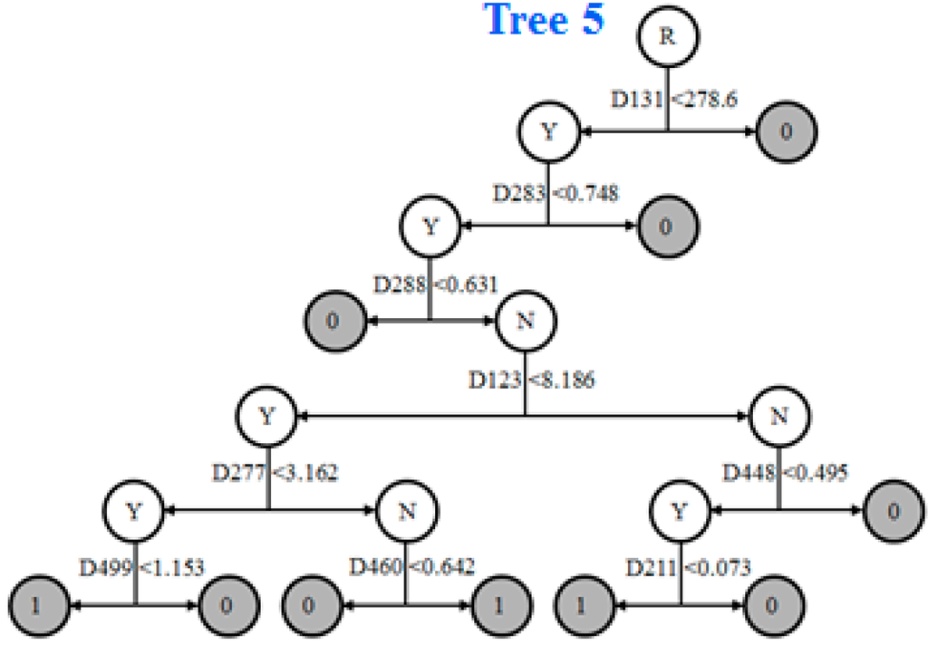 The AFP binding activity prediction DF model was constructed using the 125 chemicals of the training data set. The DF model consisted of five decision trees that are illustrated in Figure 6. The trees had eight to ten terminal nodes. The DF model was used to predict AFP binding activity for the 22 chemicals from the external data set. The 22 chemicals, including their names used in the literature, experimental AFP binding data, DF model prediction results and the references are given in Table 3.