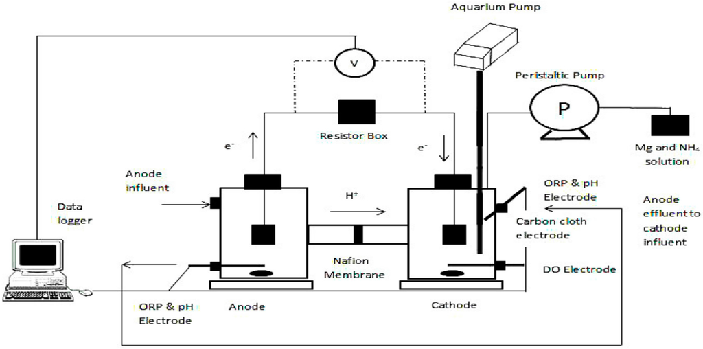 Recent research findings on MFCs have demonstrated their potential to recover P as struvite [7,8,9]. P can be recovered exclusively through precipitation in MFC because P compounds are not involved in electron transfer via reduction—oxidation (REDOX) reactions [10]. P recovery as struvite using MFCs involves cathode reactions, whereby water is consumed and hydroxide is generated due to electrons transferred from the anode to the cathode (Equations (1) and (2)):