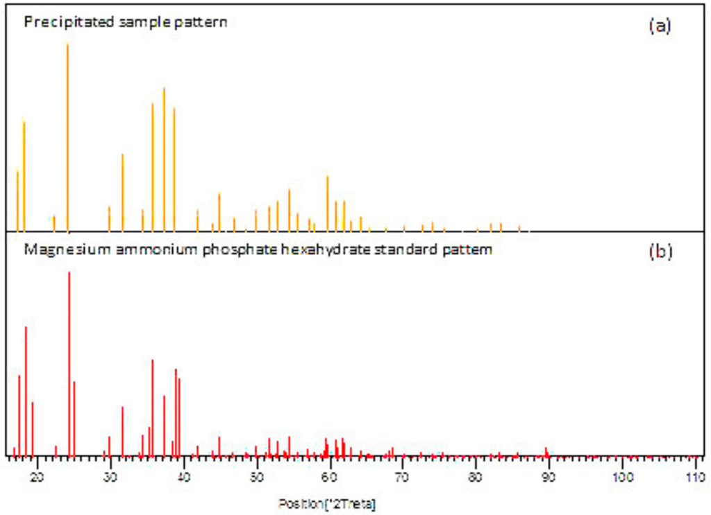XRD patterns of precipitates in the cathode chamber, (a) precipitated sample; and (b) magnesium ammonium phosphate standard.