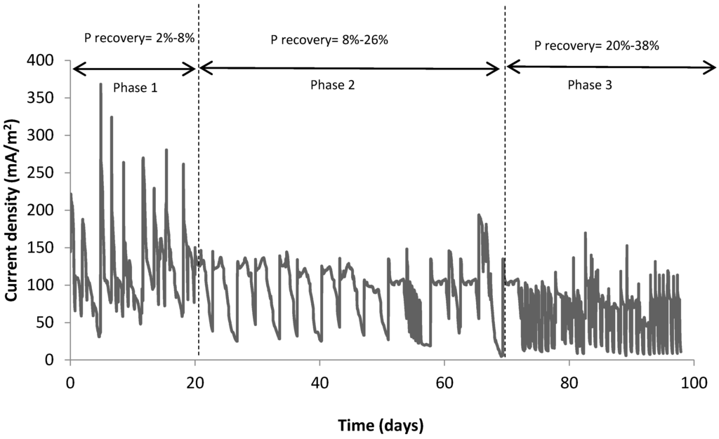 In phase 3 (COD = 1.5 g/L), the decrease in current density was significantly more as a result of the increased amount of precipitates on the cathode electrode (Figure 4). Average cathode pH increased and peaked at 8.3. The maximum P recovery was achieved in phase 3 with a maximum recovery of 38%. These results implies that the greater the precipitates at the cathode, the less energy generated by the MFC.