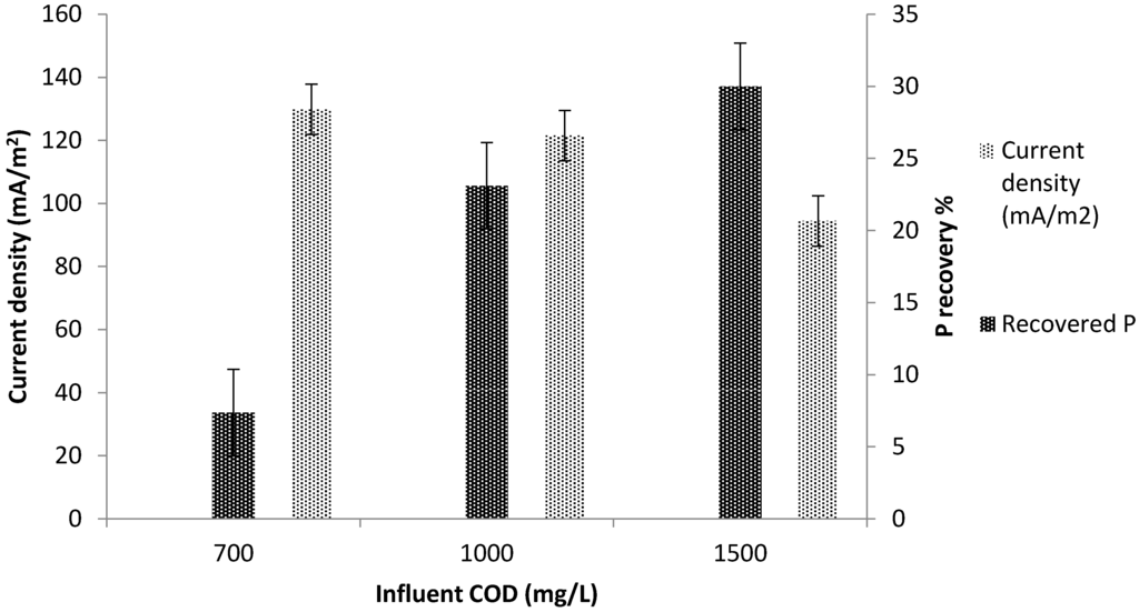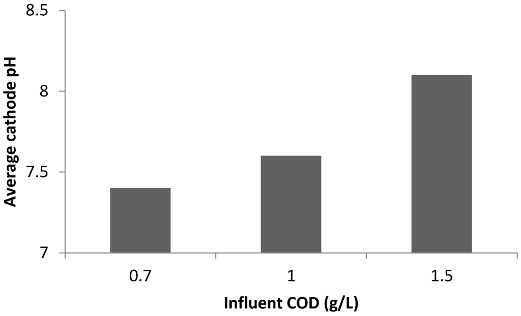 It was noted that cathode pH increased as COD concentration increased (Figure 7). The average cathode pH increased from 7.4 at COD = 0.7 g/L to 8.3 at COD = 1.5 g/L. Energy generation was negatively affected by P precipitation in the cathode chamber. As COD concentration increased, more precipitates on the cathode were observed. The current density decreased with increasing COD concentration due to the amount of precipitates on the cathode surface (Figure 6).