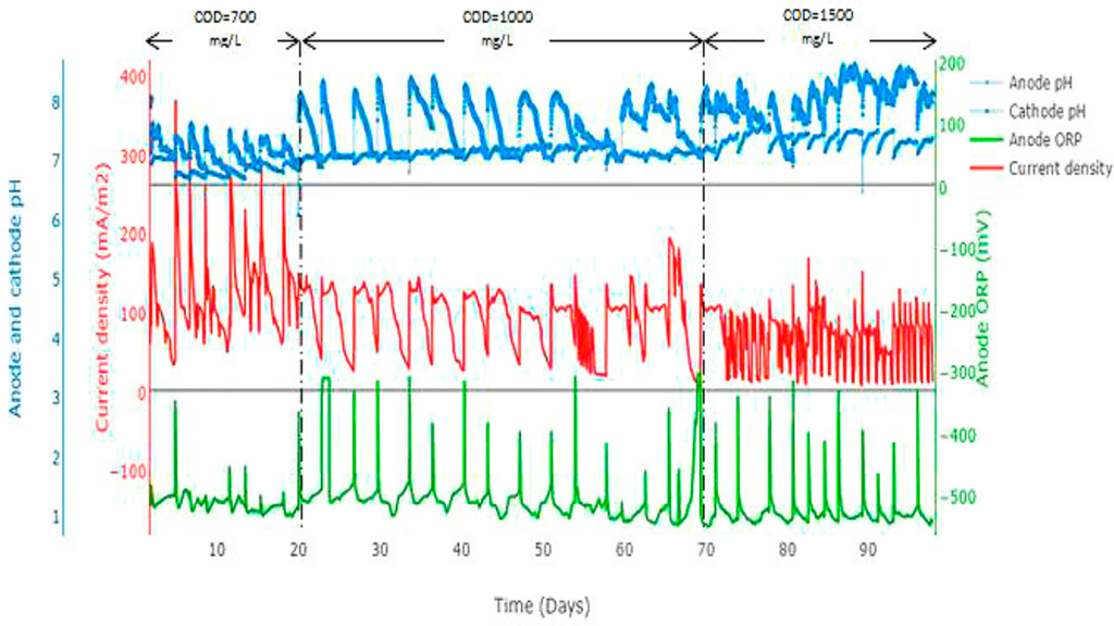 Impact of COD on current density, anode ORP, anode and cathode pH.
