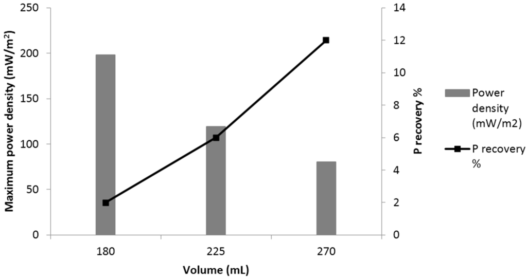 Electrolyte volume is another important parameter for P recovery. Three different volumes (180, 225, and 270 mL) were used to investigate the impact of anode and cathode volumes on P recovery and energy generation. The volumes were chosen based on the total volume of the chamber and the electrode surface area.