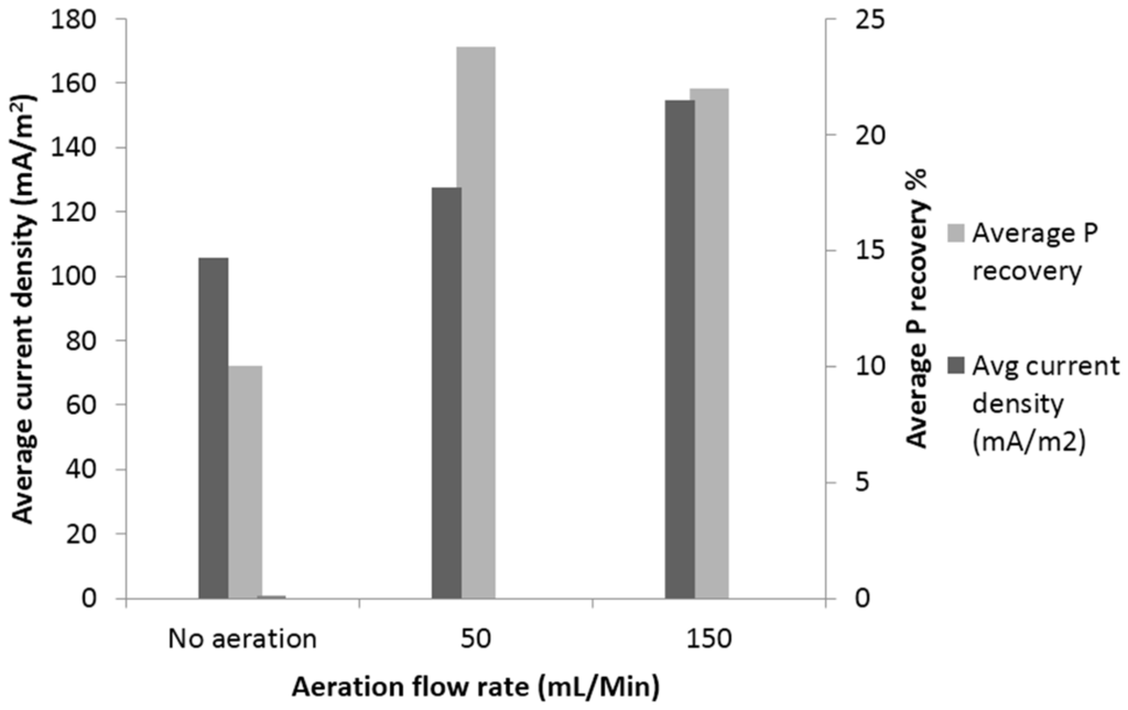 Cathode aeration is an important parameter for system optimization. The microbial fuel cells were operated under controlled dissolved oxygen concentrations; different aeration flow rates were used to examine the impact of aeration on both energy generation and P recovery. Identifying the impacts of aeration flow rates on MFC performance is important for scaling up the system and assessing the operational cost. Previous studies have shown that cathode aeration has a great impact on energy generation, where the current increased as the DO concentration increased. These results show the importance of supplying the optimal amount of oxygen to obtain optimal performance of the MFC [18]. The average current density of the MFC under three different aeration flow rates (no aeration, 50 and 150 mL/min) were 92, 127 and 155 mA/m2, respectively. Applying aeration in the cathode chamber with a flow rate of (150 mL/min) increased the average current density by more than 40% (from 92 to 155 mA/m2) (Figure 9). In addition, the generated power was increased, and these were in agreement with similar findings by Mashkour and Rahimnejad [18].