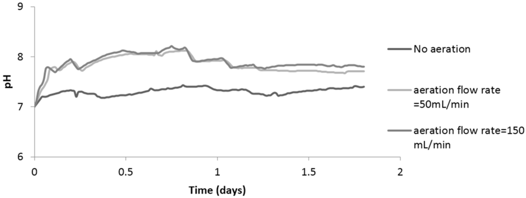 With regard to P recovery, it was found that increasing aeration flow rate at the cathode leads to increase in cathode pH, where oxygen is being used as an electron acceptor and hydroxide ions are produced [10]. With (50 mL/min) flow rate, cathode pH reached 8.5, which was optimal for P recovery as struvite; whereas with no aeration, cathode pH reached 7.5 (Figure 10). The difference in P recovery between the flow rates of 50 mL/min and 150 mL/min was not significant; however, there was an increase of 25% in power density when the aeration flow rate increased from 50 to 150 mL/min. These results show that passive or low aeration cannot supply enough oxygen for the transferred protons from the anode chamber. These findings also show that cathode aeration is an influencing factor for energy generation and P recovery.