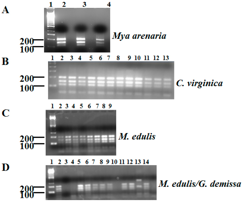 Genetic variation is common among G. lamblia strains [16,17]. Seven genotypes are commonly accepted as distinctive evolutionary lineages by restriction fragment length polymorphism (RFLP) [18,19]. Several studies have revealed multiple differences among these lineages, including drug sensitivity, metabolism, and host preference [18,19]. Humans are only infected by assemblages A and B, while assemblages C and D infect dogs; hoofed animals are infected by assemblage E [18]. Moreover, assemblage F infects cats, while assemblage G only infects rodents [18]. Restriction fragment length polymorphism of G. lamblia positive samples, revealed assemblage A in all of the Mya arenaria specimens (Figure 2A and Table 4) as evidenced by the expected fragments of 201, 150, 110, and 50 bp. Sequence analysis of the PCR fragment confirmed that they belonged to sub-assemblage AII previously shown to be associated with humans and cats [20]. Likewise, assemblage A was the only genotype observed in the Crassostrea virginica positive samples (Figure 2B and Table 4). Sequence analysis revealed G. lamblia of the sub-assemblage AI was revealed in all the oyster samples. Sub-assemblage AI is found in cats and humans [20]. We were able to assess the genotype of two of the G. demissa G. lamblia-positive specimens (2/3) and found that one specimen belonged to assemblage C as evidenced by DNA fragments of 194, 150, 102, 50, 15 bp, while the other belonged to assemblage D (200, 194, and 117 bp) (Figure 2C and Table 4). The sequencing data support that finding. We genotyped 16/20 Mytilis edulis positive for G. lamblia DNA. Eight belonged to sub-assemblage AII, while the remainder belonged to assemblage C (Figure 2D and Table 4). Overall, 68% of the bivalves collected at Orchard beach in the fall of 2014 had the G. lamblia sub-assemblage AII genotype, while 36% belonged to assemblage C, and 4% belonged to assemblage D (Table 4). The DNA sequences from all the samples were exact matches to reference genotype.