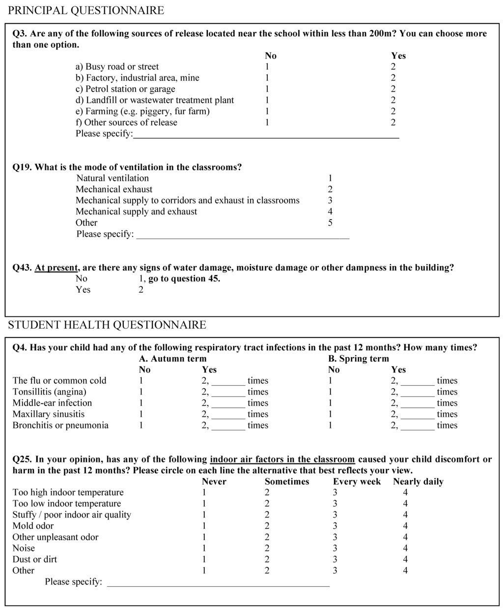 The data used in this study are from school principal questionnaires and student health questionnaires. A total of 2769 validated questionnaires [28] were administered in December 2007 to all Finnish elementary school principals, and 1154 of them were returned (response rate of 42%). Fifty one IEQ related questions were asked, including questions on classroom ventilation, temperature, and observations of moisture damage. Also, some basic information was asked about personnel working in the schools. The principals were encouraged to ask for help from their school technical personnel or the municipality when answering the questions. Few examples of the questions asked are shown in Figure 1.