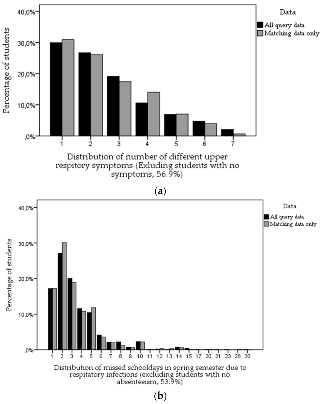 Table 1 and Figure 2a,b show the distributions of number of upper respiratory symptoms and missed school days due to respiratory infections in the spring semester. There were no significant differences between all query data and sample of schools with matched principal questionnaire data. The majority of the students did not report any upper respiratory symptoms (57%) and were present throughout the period (54%). Some 11% of students reported at least two different types of upper respiratory symptoms, and 5% reported four symptoms or more. Among those that missed school due to health symptoms, there was an average of 3.4 missed school days with 29% missing two school days.