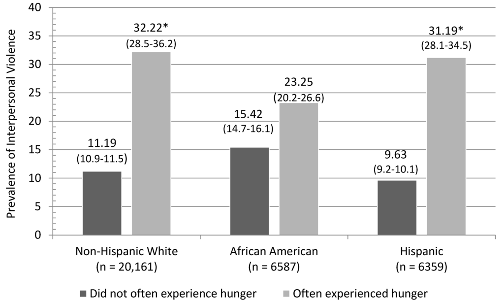 Survey adjusted prevalence estimates of interpersonal violence among individuals who often experienced hunger by race/ethnicity. Differences significant (p < 0.05) while controlling for sociodemographic, parental, and psychiatric confounds are indicated by the use of an asterisk (*) next to the higher prevalence estimate.