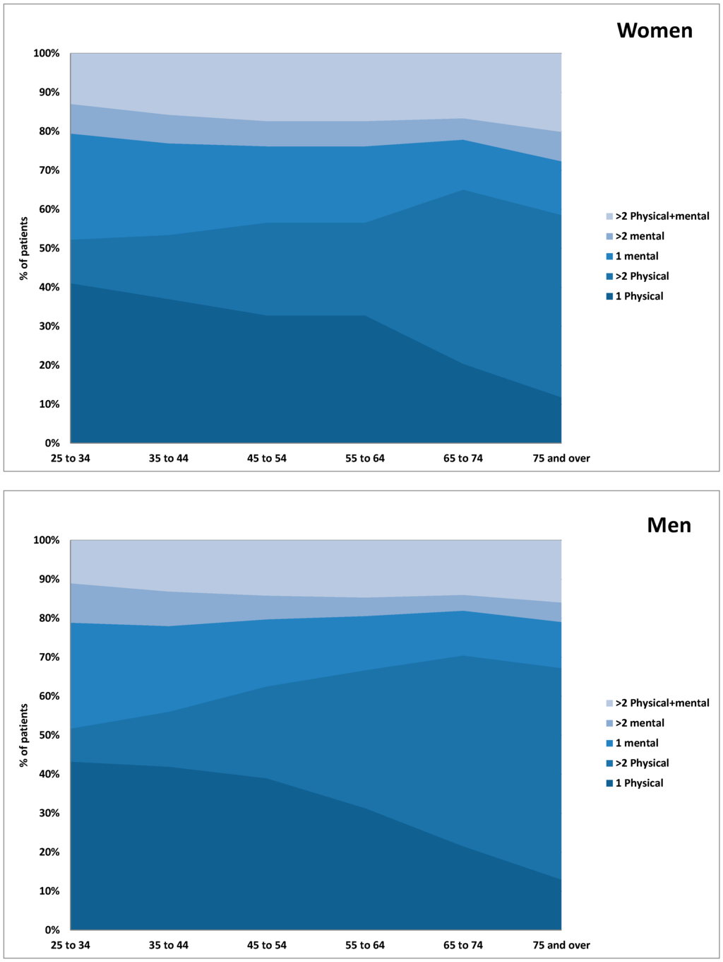 This study has examined patterns of multimorbidity by age and sex in 1,272,685 adults in a nationally representative primary care sample in Scotland. Women had more overall multimorbidity than men at all ages, although the sex differences were relatively small. From the age of 45, physical-only multimorbidity was consistently more common in men, and physical-mental multimorbidity more common in women. The biggest sex difference in physical-mental multimorbidity was found in the 75 years and over group. The commonest condition in women was depression until the age of 55 years, thereafter hypertension. Depression, pain, irritable bowel syndrome and thyroid disorders were more common in women than men across all age groups.