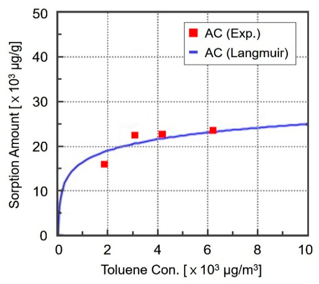 A previous study on the pollutant adsorption performance of activated carbon (AC) using a boundary layer-type small test chamber (BLTSTC) showed that when toluene was injected at a concentration of 280 μg/m3, the total pollutant inhalation volume detected after 7 days was 9.6 μg/g, which indicates that the adsorption volume was not that significant [4,6]. However, the adsorption isotherm of Figure 1 shows that the adsorption volume of toluene by the AC increased as the concentration of toluene increased. This means that when the concentration of indoor toluene is high, a corresponding improvement in toluene adsorption performance can be expected. Accordingly, in this research, activated carbon was used as the sorptive building material and toluene was set as the pollutant to be adsorbed.