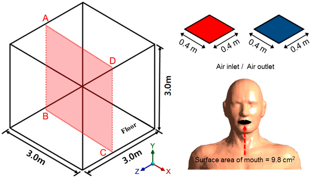 The CFD analysis model for reviewing the diffusion and adsorption of pollutants in the indoor space is shown in Figure 2. Mechanical ventilation was operated in a space measuring 3 m in length, width, and height, and the area of the inlet and outlet was identically set to 0.16 m2. To review the thermal diffusion and air distribution near the surface according to the heat of an occupant, a human body structure similar to a real body was used. The size of the inlet of the applied human body model was about 9.8 cm2, based on data from previous studies [7,8].