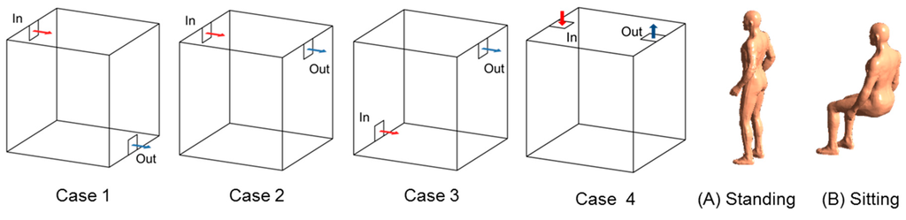 In addition, a case study was conducted to determine the pollutant concentration reducing effect of sorptive building materials and an optimal installation plan for sorptive building materials considering four types of air diffuser methods and two types of occupant postures, as shown in Figure 3; the corresponding case conditions are shown in Table 2.