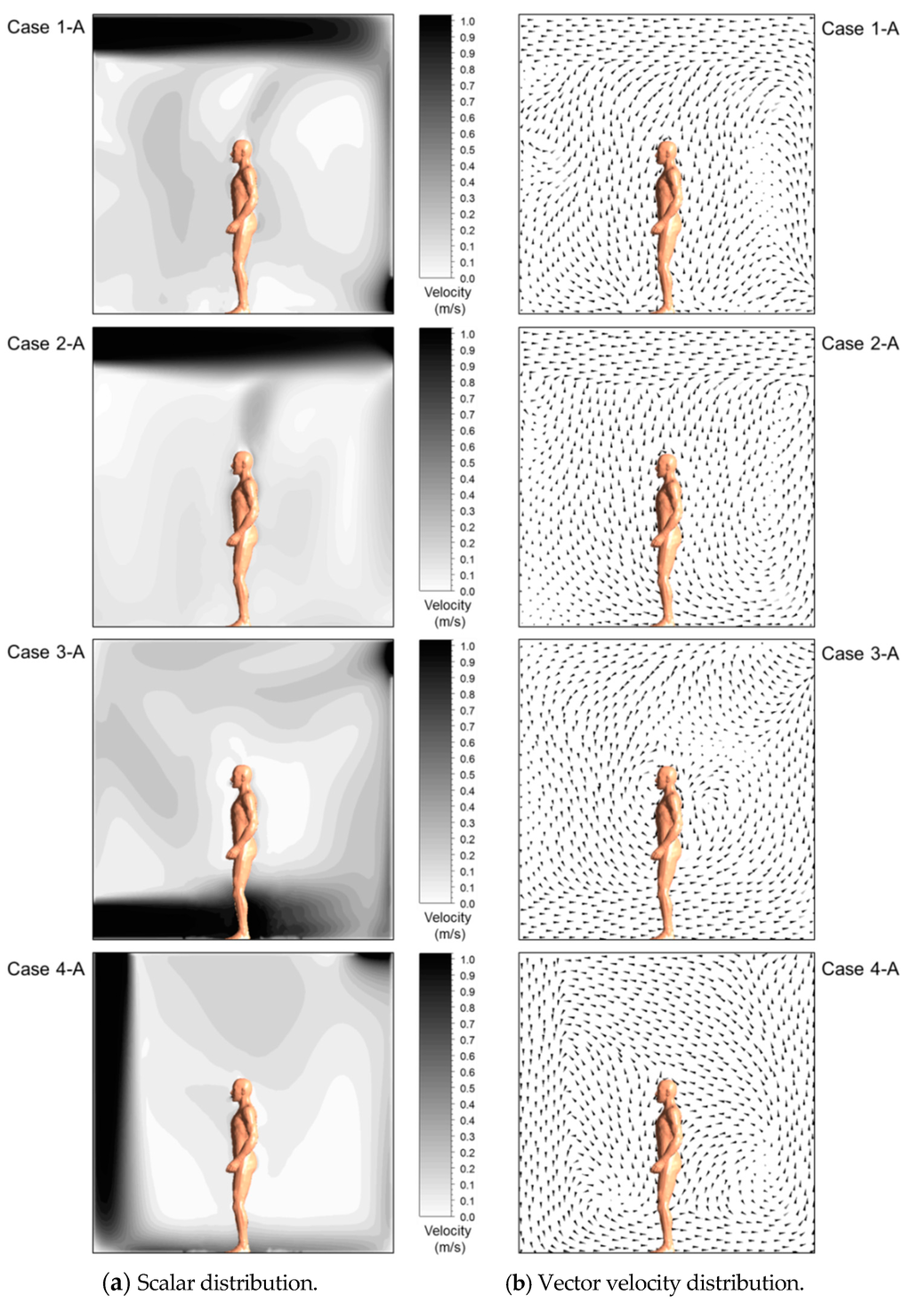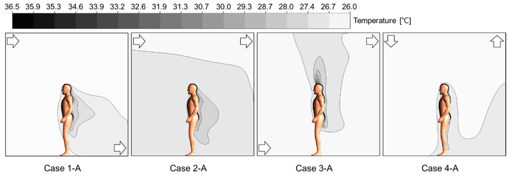Figure 4 shows the air distribution maps for each air diffuser condition when the occupant was standing. Regardless of the case, the velocity of the air current around the inlet was observed to be the highest. In Case 2, where the inlet and outlet were placed on the upper side, the velocity of airflow was somewhat low because the introduced air current escaped through the outlet without being distributed in the air flow. In addition, it was revealed that temperature changed around the occupant’s body surface due to the heat generated by the occupant, as illustrated in Figure 5.