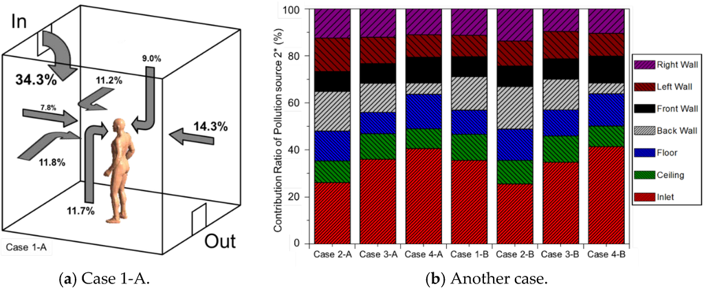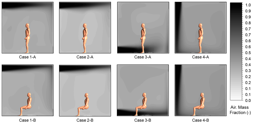In this research, toluene was used as the pollution source and CRP 2 * was calculated by assigning a pollutant concentration condition (mass fraction = 1.0) to each wall’s surface. Figure 6 shows the mass fraction distribution of fresh outdoor air introduced to the indoor space through the inlet. The indoor concentration diffusion of the outdoor air was highly dependent on the velocity of the air current and thus showed a tendency similar to the air current distribution. The contribution ratio, calculated in order to consider the optimal installation plan for sorptive building materials around the occupant, is shown in Figure 7. The sum of the percentage of CRP 2 * in each case was set to 100%, and the change in the contribution ratio of each pollution source was observed to be larger according to the air diffusion method rather than the posture of the occupant. This is deemed to be because the breathing areas formed by the occupant while standing or sitting do not have a large effect. However, in Case 4, where the air supply and exhaust were at the ceiling, the ratio of fresh outdoor air to the respiration volume of the occupant was the highest. This means that in subject spaces where the length, height, and width are identical to each other and a constant outdoor air volume is supplied indoors, ceiling air supply systems cause the highest amount of fresh outdoor air to be present in the breathing area of the occupant. In Case 2, the age of the air was lowest as the fresh outdoor air was discharged through the outlet without being disturbed by the flow of air current, and therefore the contribution ratio of the fresh outdoor air to the respiration volume of the indoor occupant was about 26.3%.