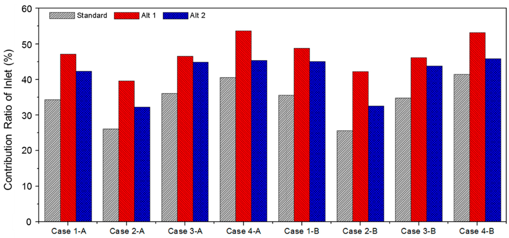 Calculating the contribution ratio (CRP 2 *) of each pollution source before installing sorptive building materials showed that the contribution ratio of the pollutant generated from the side vertically closest to the inlet turned out to be the highest in every case. Accordingly, it was confirmed that the floor in Case 4 and the back wall in the remaining cases had the highest contribution rate; the pollution source with the highest contribution ratio was set as the object while reviewing the change in the contribution rate of the fresh outdoor air according to the sorptive building materials for determining the optimal installation plan for sorptive building materials. In addition, as a control group, sorptive building materials were installed at the pollution source with the lowest contribution ratio (Alt 2). The results from both cases were compared to each other. Figure 8 shows the change in the contribution ratio of the fresh outdoor air according to the installation of sorptive building materials on the applied sides. In the case where sorptive building materials were installed at the pollution source with the highest contribution ratio (Alt 1) before the installation of sorptive building materials (Standard), the ratio of the fresh outdoor air to the respiration volume of the occupant increased from 25.6% to a maximum of 42.3%. When compared to the control group, the contribution ratio of the fresh outdoor air increased when compared to the ratio before the installation of the sorptive building materials, and the case where sorptive building materials were installed in the place with the highest pollution source contribution ratio showed the best pollutant concentration reducing effect around the occupant.