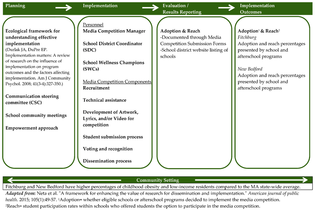 Understanding the community setting, which is shown at the base of the model in Figure 1, is essential for successful intervention adoption []. For MA-CORD, the community context was a cross-cutting factor that affected each aspect of implementation. The media competition was implemented in Fitchburg and New Bedford, Massachusetts. Table 1 lists the characteristics of each community. Fitchburg has 40,514 residents with 6 public schools serving kindergarten through 8th grade, and New Bedford has 95,502 residents with 23 public schools serving kindergarten through 8th grade, including 21 elementary schools and 2 middle schools. Across both communities, non-Hispanic white residents are the majority population (68% of residents) and Hispanics (18%–22%) are the largest minority group. Both communities have a higher percentage of low-income residents and children classified as overweight or obese compared to the MA state-wide average.