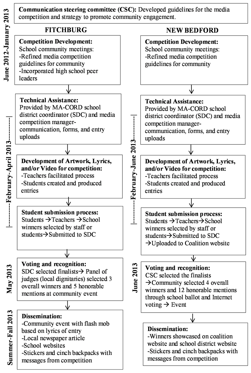 The research team initiated a Communication Steering Committee (CSC) to guide the development of the media competition and further communication initiatives for the broader MA-CORD intervention. The committee consisted of teachers, nurses, and coalition members from each community, and representatives from the Massachusetts Department of Public Health and Harvard T.H. Chan School of Public Health. The CSC oversaw the media competition process and provided solutions concerning research and implementation issues. One main decision point was offering the students three types of submissions options (i.e., video, lyrics, and artwork) instead of one option (e.g., poster). The full CSC met twice and a smaller subset met regularly at the weekly MA-CORD meetings during the development and implementation of the media competition.