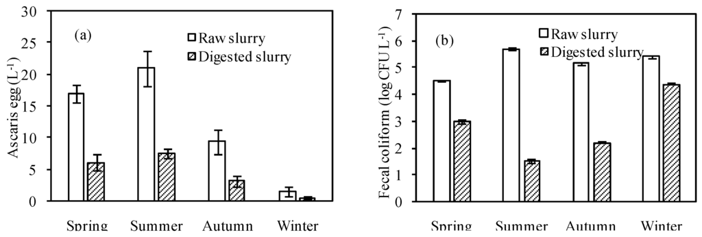 No schistosoma eggs were detected in both raw and digested pig slurries. Hookworm egg contents were less than 1 L−1 in three seasons (spring, summer and autumn) and was below the detection limit in winter in these slurries. Ascaris egg contents in spring and summer were fairly high compared to autumn and winter in both raw and digested slurries (Figure 1a). The results of the hygienic analysis obtained in current study were compared with the discharge standard of pollutants (fecal coliform ≤ 10,000 CFU·L−1, ascaris eggs ≤ 2 L−1) for livestock and poultry breeding in China (GB18596-2001). Fecal coliforms in raw pig slurry fluctuated with season (Figure 1b), but decreased drastically (by 99%) after anaerobic digestion. It met the discharge standard except in winter (25,000 CFU·L−1). Côté et al. [20] enumerated E. coli in 20 samples of digested pig slurries, among which E. coli was not detected in 15 samples and E. coli enumeration was reduced with 2.48–4.16 log CFU·mL−1 (99.67%–99.99% reduction) in the other five samples. Although the anaerobic digestion process results in an efficient removal of pathogens and parasites, ascaris eggs (or helminth eggs) remaining in digested sludge [9,21] and co-digested organic wastes [10] have been reported. Ascaris egg contents in this digested slurry exceeded discharge standards except in winter, but the anaerobic digestion process still led to decrease of ascaris egg contents by 60%–66% (Figure 1a). This result suggests anaerobic digestion reduced most fecal coliforms and parasite eggs and improved the hygienic condition [21].