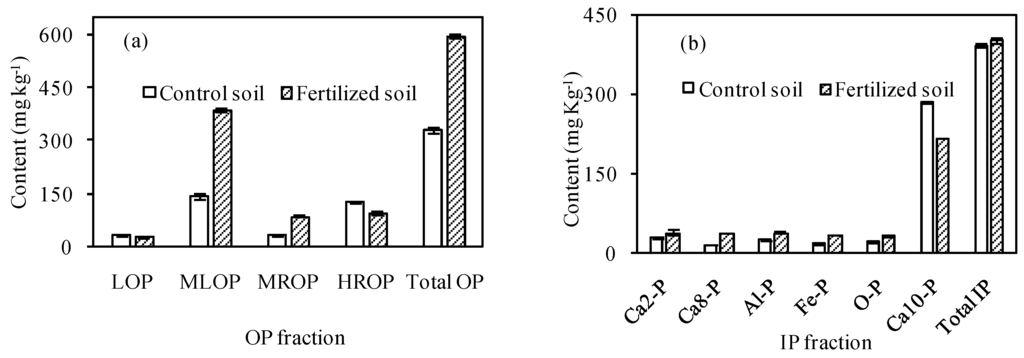 Figure 2. Fractionation of OP (a) and IP (b) in control and fertilized soils.