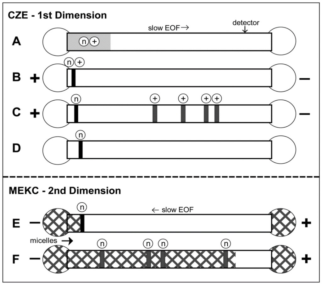 Stacking and separations of two different classes of compounds [cationic (+) and neutral (n) analytes] in interface-free 2-D heart-cutting CE (CZE × MEKC). (A) The fused-silica capillary was filled with a low-pH CZE electrolyte. The sample was injected as a long plug. The CZE electrolye was placed at both ends of the capillary; (B) A voltage was applied at positive polarity (cathode at the detector end). The analytes were focused by stacking; (C) Continued application of voltage caused the migration of the concentrated cationic analytes to the detector; (D) The cationic analytes migrated out of the capillary, and the concentrated neutral analytes were purified and remained inside the capillary. The first dimension analysis ended; (E) The start of the second dimension analysis was the replacement of the CZE electrolye at both ends of the capillary by the low-pH MEKC electrolyte with SDS micelles. The presence of micelles is depicted by the square patterned zones. Application of voltage at negative polarity (anode at detector end) caused the electrophoretic migration of the SDS micelles into the capillary. The micelles eventually penetrated or swept the neutral analyte fraction; (F) Continued application of voltage caused the micelle-bound analytes to separate and migrate to the detector. The second dimension and analysis ends when all the analytes were detected. Reprinted with permission from [95]. Copyright (2016) American Chemical Society.