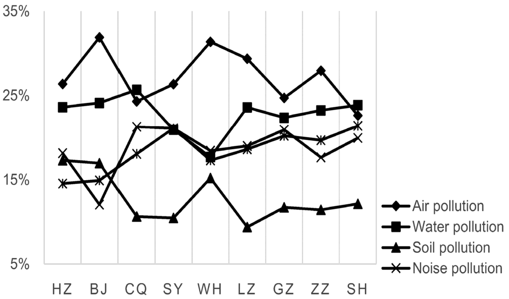 Figure 1 illustrates the attention paid by respondents to various environmental problems. On average, soil pollution was the primary concern of only 12.81% of the residents, which was much lower than for the other four environmental pollutions—air pollution (27.22%), water pollution (22.80%), noise pollution (18.73%) and waste pollution (18.43%). The results indicate that while the respondents generally recognized soil pollution as a problem, their concern about soil pollution was lower than about other environmental issues due to its hidden properties and relatively lower media exposure. The familiarity with soil contamination was shown to be “low” to “very low” by a majority of the residents, except for Hangzhou and Beijing, where it was moderate to high. These results may be due to two well-known accidents where toxic gases escaped from in-situ remediation in a pesticide factory in Hangzhou and a coking plant in Beijing, causing secondary pollution that affected the surrounding residents. Here, secondary pollution means the pollution caused by improper actions during soil remediation process, e.g., toxic gas effusion and residue disposal.