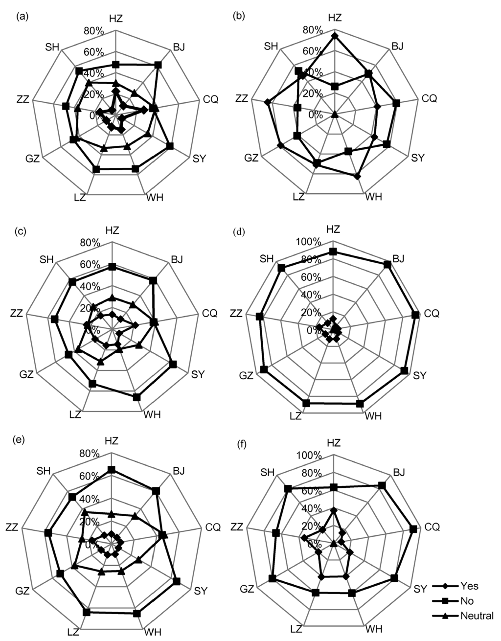 Based on the results of ANOVA analysis, public perception in the nine cities can be categorized into three groups (Table 9). First, the public perception level of Shenyang (Group I) was found to be significantly higher than that of Hangzhou, Wuhan and Zhuzhou (Group J). The other significant difference was between Shenyang (Group I) and Hangzhou, Beijing, Wuhan and Zhuzhou (Group J).