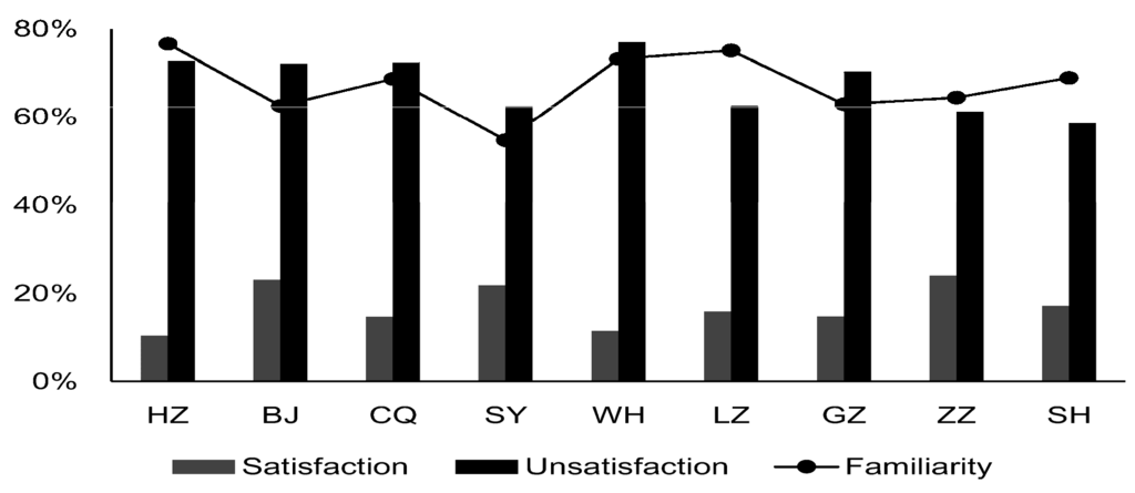 There was a disparity between the willingness to be informed and administrative nonfeasance. 70.61% and 65.64% of the residents respectively were unsatisfied with the frequency of knowledge dissemination (Table 4, entitled “Frequency”) and convenience for public participation (Table 4, entitled “Convenience”). Among the nine cities, Chongqing was an exceptional case. Chongqing had established oriented and effective departments to deal with issues engaged in contaminated site management. As a result, it had better performance by the environmental protection department in information disclosure (26.8%), publicity and education (21.7%) and public participation (8.1%), and the highest public satisfaction with policy instruments (average 20.8%) (Table 4). The pathways for information disclosure, publicity and education and public participation preferred by residents did not present significant regional differences. The most popular ways for information disclosure and knowledge popularization were similar to those for knowing about soil pollution. Instead of letters (average 7.2%) and e-mail (average 10.58%), public meetings (average 35.19%), hearings (average 28.61%) and telephone (average 18.42%) were considered the top three ways preferred for public participation due to their characteristics of direct feedback and interactive communication.