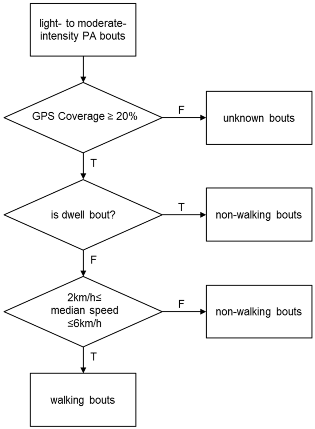 Light- to moderate-intensity physical activity bouts identified using accelerometer counts of pre-defined speed ranges as noted above were subsequently considered walking bouts only when their corresponding GPS data satisfied three selection criteria. First, in order to provide sufficient spatial context information to distinguish between a walking bout and a non-walking bout, the bout required at least three GPS records, with ≥20% of bout records having matching GPS records. Second, bouts that occurred within a small spatial extent were considered as “dwells” and thus non-walking activities. To identify dwell bouts, the distances from each point to all other points within the bout were measured; bouts with their 95th percentile inter-point distance ≤40 m [30] were considered dwell bouts [26]. Only bouts with ≥10 GPS records were screened for being dwell bouts because non-dwell bouts with few GPS records were likely to have inter-point distance ≤40 m [26]. Finally, the GPS-derived median speed was required to range between 2 km/h and 6 km/h, based on two studies that identified walking trips in free-living conditions using GPS data [31,32].