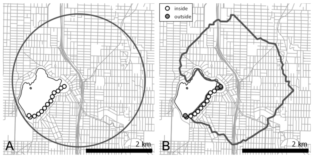 Two neighborhood buffer types drawn around the home location with resampled GPS points from a walking bout. (A) A walking bout entirely inside of a 2-km Euclidean buffer; (B) A walking bout partially inside and outside of a 2-km network buffer.