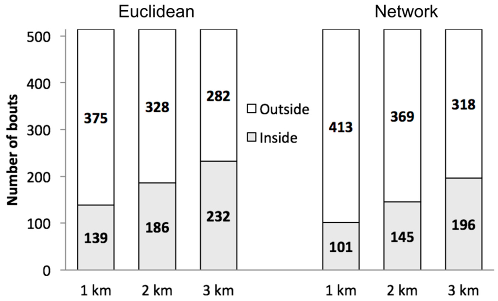 The counts of walking bouts are shown in Figure 3, with Euclidean buffers in the left panel, and network buffers in the right panel. More walking bouts were identified inside the neighborhood for Euclidean compared to network buffers of the same radius because Euclidean buffers cover a bigger area that completely includes network buffers (Figure 2). Irrespective of buffer type, the number of walking bouts inside the neighborhood increased with buffer size. More walking bouts occurred outside than inside of the neighborhood for all six buffers (e.g., 232 inside and 282 outside of the 3-km Euclidean neighborhood buffer), decreasing with buffer radius.