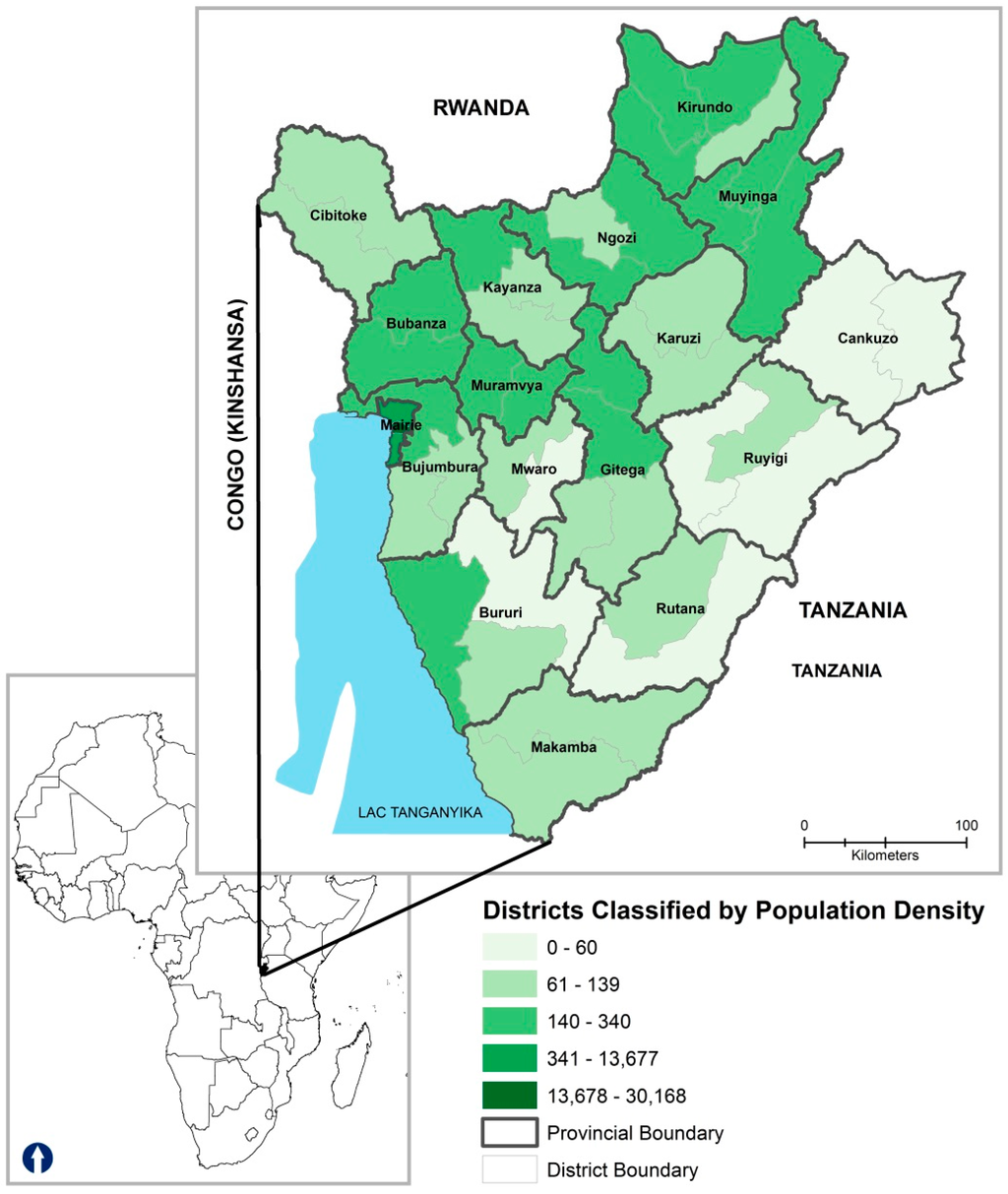 Burundi, located in East-Central Africa, is one of the most densely populated regions in central Africa. It has a tropical highland climate with significant daily temperature fluctuations varying greatly between regions mainly due to differences in altitude [14]. Burundi is comprised of eighteen provinces (Figure 1), each named after their respective capital with the exception of Bujumbura Rural. The newest province, Rumonge, was created on 26 March 2015 from five districts previously belonging to the provinces of Bujumbura Rural and Bururi.