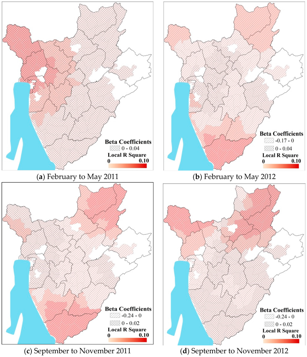 Results of Geographically Weighted Regression (GWR) analysis during the wet seasons (a) February to May 2011; (b) February to May 2012; (c) September to November 2011; (d) September to November 2012.