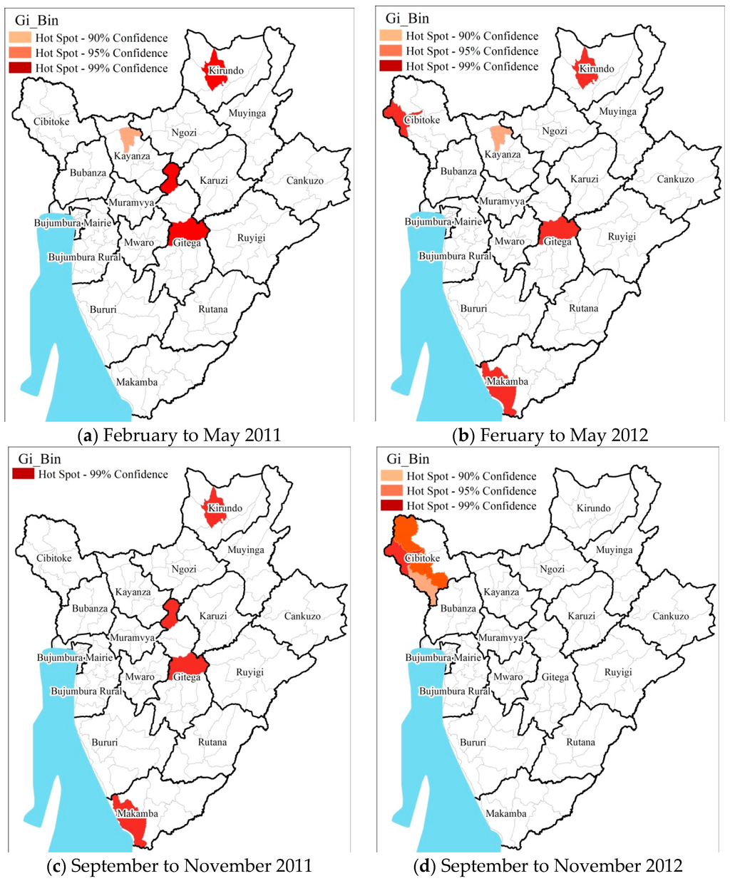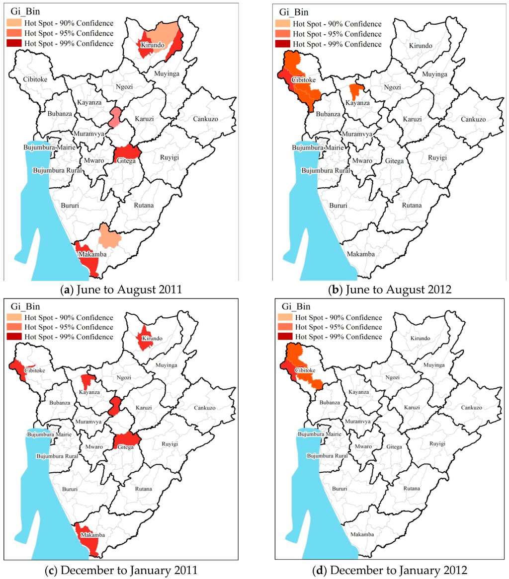 To evaluate the spatial clustering of pediatric malaria cases, the results of Hot Spots Analysis was mapped at the seasonal level (Figure 4 and Figure 5). The distribution of pediatric malaria (greater than 1000 cases for the entire study periods) varied at the district/provincial level during the different seasons in the Burundi region during the study period (Figure 4). Districts which showed consistently significant hotspots during the four seasons were located in the provinces of Kirundo, Gitega, and Makamba at the 99% confidence level (p < 0.01). The highest variation was in northern provinces of Cibitoke (districts Rugombo, Mugina and Mzurwi), Kirundo (districts Kirundo, Busoni and Bwambarangwe), Kayanza (district Kayanza); in central provinces of Gitega (districts Mutaho and Gitega) and in the southwest province of Makamba (district Nyanza-Lac).