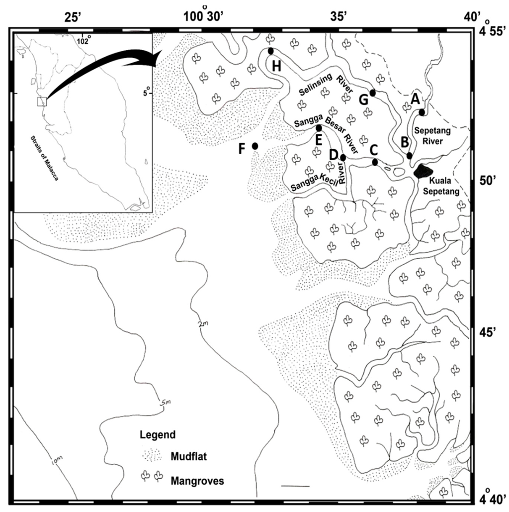 Locations of the eight sampling stations (A–H) along the Sepetang, Sangga Besar and Selinsing rivers in the Matang mangrove estuaries, Perak, Malaysia. A–H: Sampling stations along the Matang mangrove estuary, Perak, Malaysia.