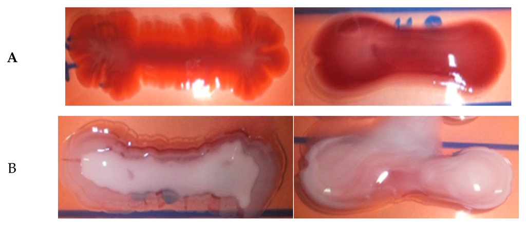 (A) From left to right: RDAR and PDAR phenotype at 37 °C after 72 h incubation; (B) From left to right: rough edge of RDAR phenotype and smooth shape of PDAR phenotype at 28 °C after 72 h incubation.
