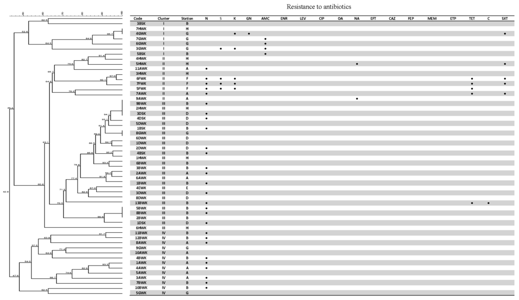 REP-PCR fingerprinting demonstrated a high genetic diversity among the aquatic-borne K. pneumoniae isolates from the Matang mangrove estuary, with 48 REP-PCR genotypes detected (Figure 3). The clustering analysis grouped the 55 K. pneumoniae isolates into four clusters (I to IV). It was found that the antibiotic-sensitive isolates from stations A, B, and G, which were located close to each other and upstream of the estuary, are grouped together in cluster IV at a similarity level of 47.3%. Antibiotic-resistant isolates, with resistance specifically to nalidixic acid, trimethoprim, streptomycin and kanamycin, are grouped together in cluster II, at a similarity level of 64.6% (Figure 3). This study demonstrated that REP-PCR could be a good rapid fingerprinting method to type K. pneumoniae isolates from the aquatic environment.