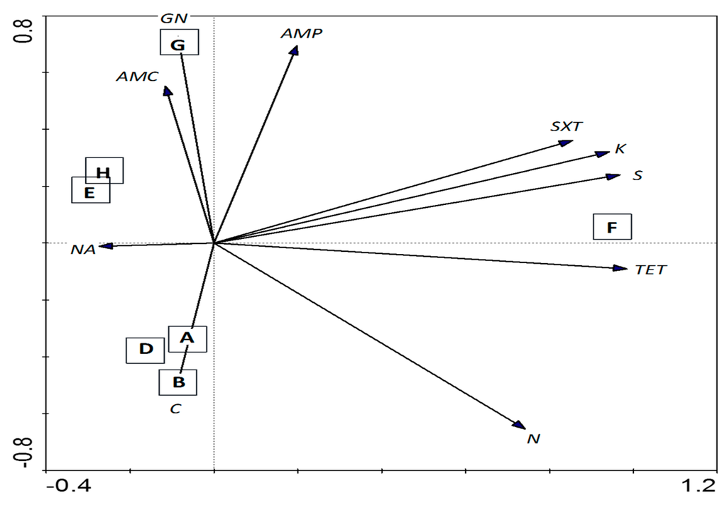 PCA ordination biplot showing the distribution of waterborne K. pneumoniae by sampling stations with respect to their susceptibility to various antibiotics. The first (PCA1) and second (PCA2) principal components respectively explained 74.2% and 17.3% of the total variance of the explanatory variables. The Capital letter in the square box denotes sampling stations located in Sepetang River (A), Sangga Besar River (B–E), Selinsing River (G and H) and adjacent coastal water (F). Black solid arrows indicate isolates demonstrating non-susceptibility towards 10 antibiotics: GN-NS, gentamicin; K-NS, kanamycin; S-NS, streptomycin; N-NS, neomycin; AMC-NS, amoxicillin/clavulanic acid; AMP-NS, ampicillin; NA-NS, nalidixic acid; TE-NS, tetracycline; SXT, sulfamethoxazole-trimethoprim; C, chloramphenicol.