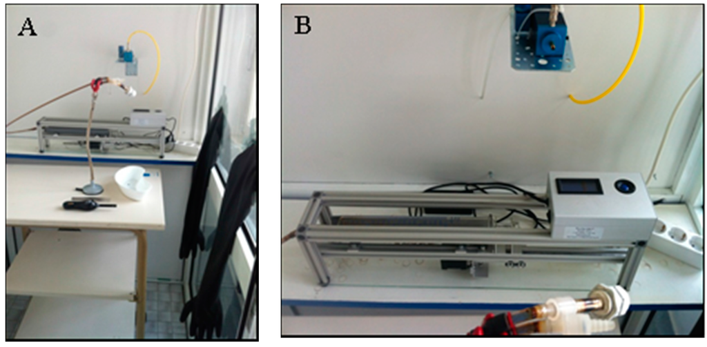 (A) The Automatic Environmental Tobacco Smoke Emitter (AETSE) in a glass chamber; (B) The AETSE in detail: a 200 mL glass syringe, a stepper motor, a microcontroller and stand equipment.