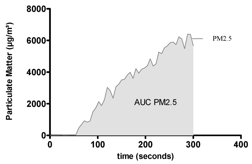 The interval from ignition to extinction (5 min) was evaluated by measuring the area under the curve (AUC) and particulate matter (PM).